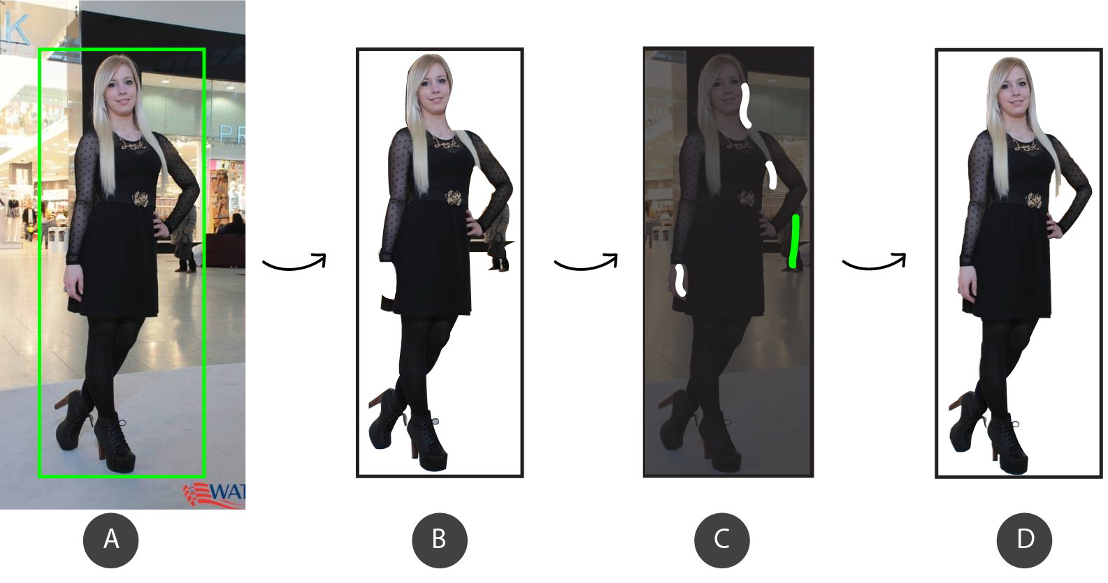 Using Kinect to identify object of interest, Magic Mirror employs the GrabCut algorithm – an interactive foreground extraction using iterated graph cuts – to extract foreground object accurately from the complex background.