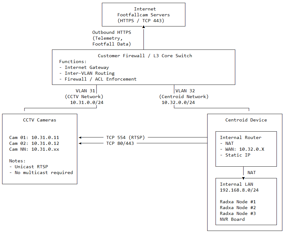 For FootfallCam Centroid to access and process live RTSP video streams from on-site NVR/DVR and CCTV cameras, all devices must reside in the same local subnet.